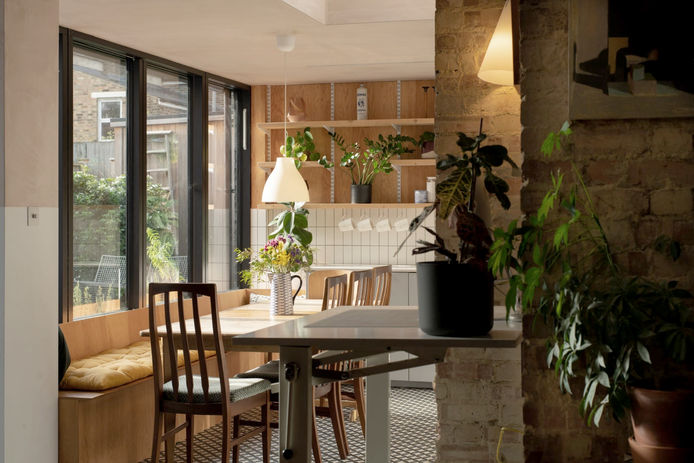 Bespoke joinery, including feature kitchen display shelving and dining bench